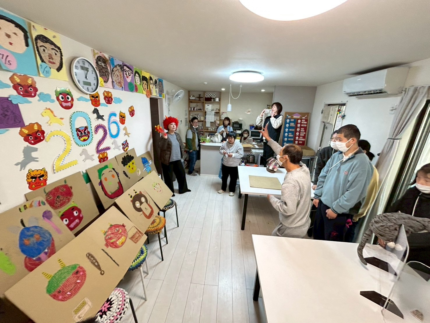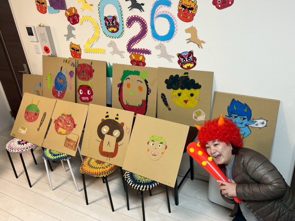 手作りの鬼パネルを前に、いざ豆まき!